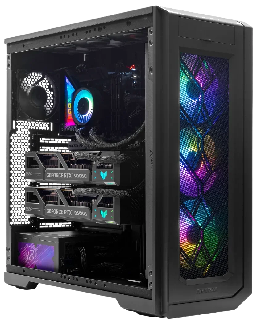 Built around the Phanteks Enthoo Pro 2 Server Edition full-tower chassis, the MES2X SE is engineered for serious professional environments. Its spacious interior accommodates high-end multi-GPU configurations with exceptional airflow and cable management, designed to run reliably under sustained workloads. A 360 mm liquid cooling system maintains stable thermals and quiet operation during extended training sessions. The 1600-watt power supply supports demanding multi-GPU and high-core CPU setups, enabling true parallel compute performance for intensive AI workflows.